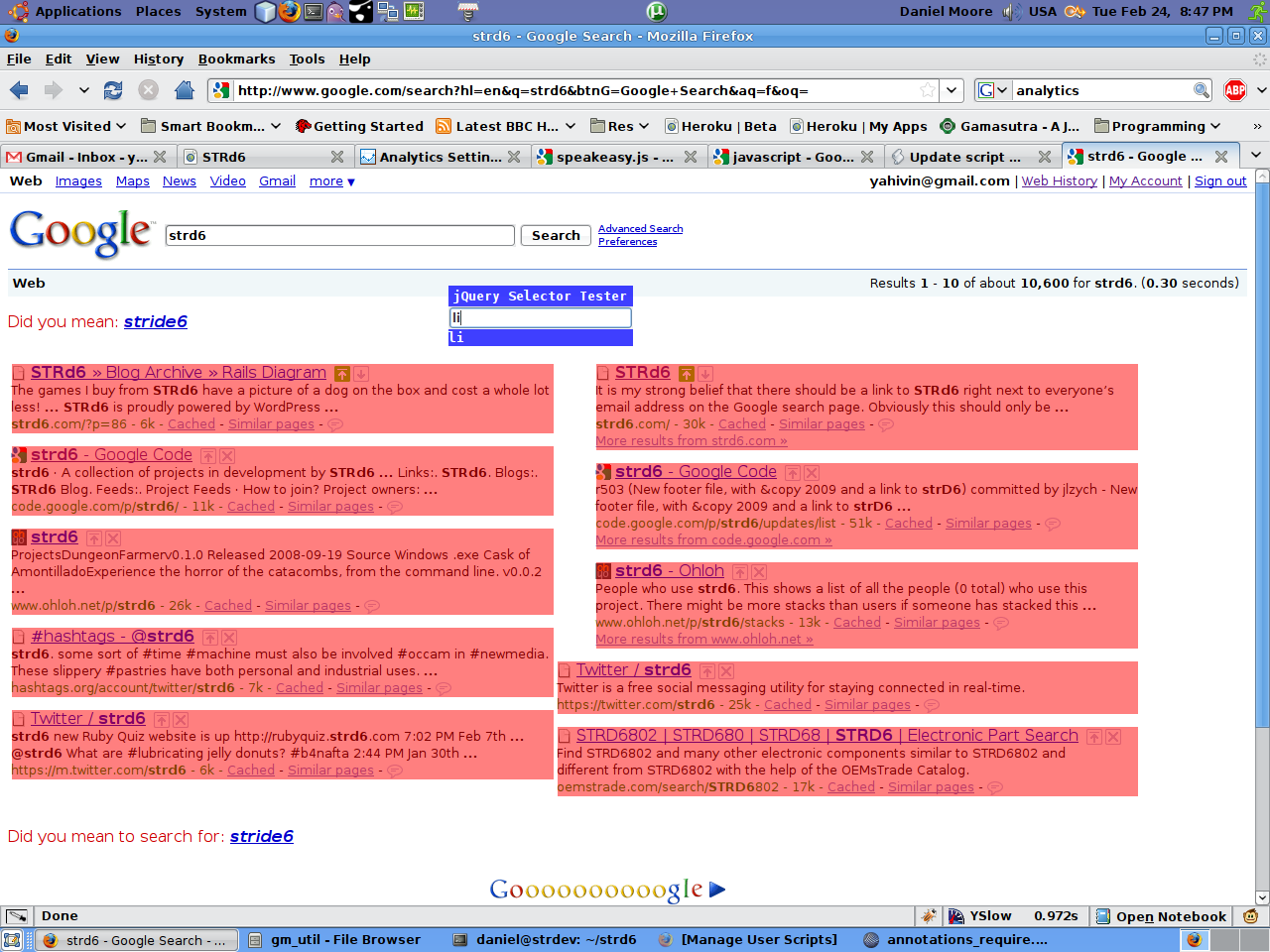 The latest release in an ongoing bender of Greasemonkey scripts involving jQuery: the jQuery Selector Tester!